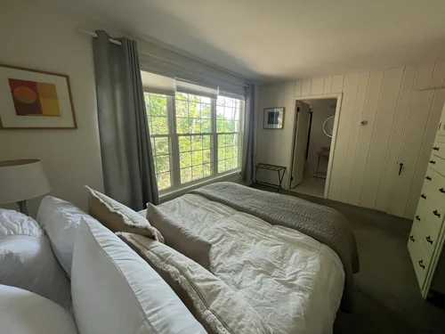 This room features a cedar closet, custom built-ins, desk space, air conditioning……and a private, fully restored mid-century modern bathroom.